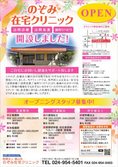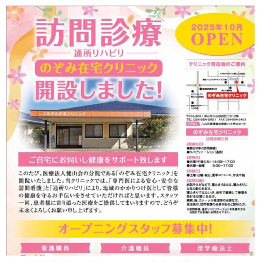 10月中旬、医療法人健山会グループ「のぞみ在宅クリニック」が郡山市八山田地区に開院いたしました。
